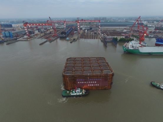 2017年5月16日4:38分,我司承接的中鐵甌江大橋鋼沉井順利下水。該沉井將通過14000噸半潛駁浮運至溫州甌江大橋工程現(xiàn)場下沉。并在錨地下沉起錨后于17日上午4:30拖航去溫州,甌江大橋沉井平面形狀為圓角矩形,鋼沉井總高 59m,鋼沉井井身平面尺寸為 66m×55m,井身材料為 Q345C 鋼材,總重18000噸。
