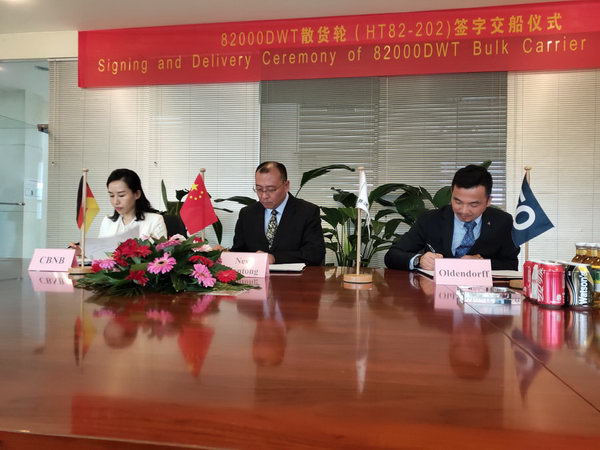 2019年5月29日,新韓通船舶重工為德國船東Oldendorff建造的82K散貨輪 “Kim Oldendorff”(船體號:HT82-202)成功舉行命名儀式, 并順利簽字交船。