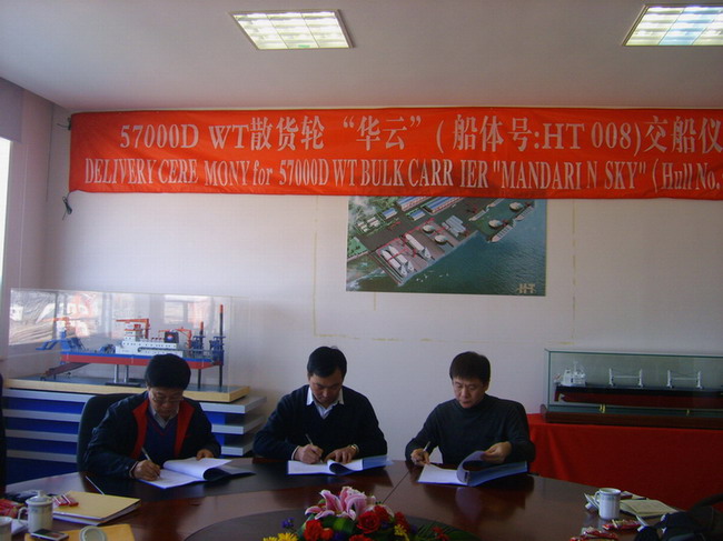 - HT008在公司6號會議室成功命名“華云”(MANDARY SKY)并順利交船。韓通重工、蘇美達和大新船務(wù)高層領(lǐng)導出席了該儀式。該散貨輪是本年度公司交付的第五條船,也是大新船東的第四條姊妹船。