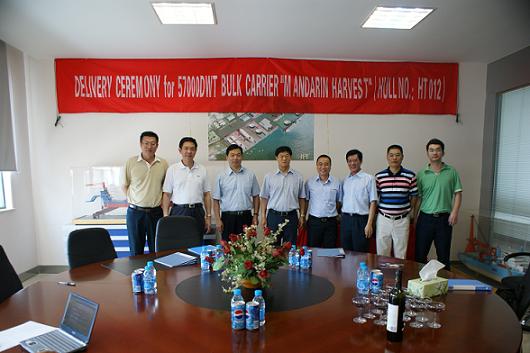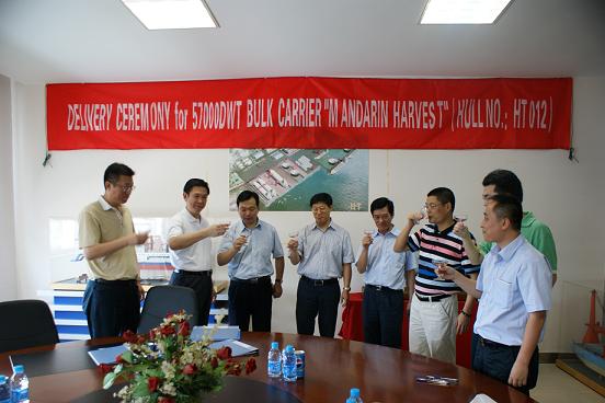 2009年7月17日上午9:00,在江蘇韓通船舶重工6號會議室舉行了57000DWT(船號:HT012)散貨輪交船儀式。該船由中航技廈門公司代理,招商銀行廈門分行提供保函,入BV船級社;該船為韓通船舶重工有限公司為新加坡大新建造第一批6條船的最后一條船,也是韓通/新韓通從2008年6月份交船以來的第10條船;經(jīng)過船東,船廠以及船級社的共同努力,該船按照合同計劃節(jié)點按時交付給船東.交船儀式后,雙方就今后的合作進行磋商并達成共識.大新船務(wù)公司總經(jīng)理張?zhí)m水先生,中航技廈門公司總經(jīng)理黃光先生,招商銀行廈門分行行長柯先生,江蘇韓通船舶重工有限公司董事長孟成君先生、總經(jīng)理武亦文先生以及各位嘉賓代表出席了該儀式。