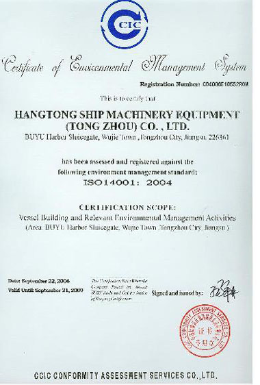 2006年8月28日,韓通船舶重工有限公司通過CCIC認(rèn)證中心關(guān)于環(huán)境安全體系的認(rèn)證,并取得了國家認(rèn)可的ISO14000的證書,這是據(jù)2006年8月份取得ISO9001證書又一重大成果。