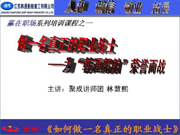 林慧熙先生從四個(gè)模塊內(nèi)容進(jìn)行了講解,富有感染力的講解結(jié)合播放錄像案例、音樂等方式讓參會人員在愉悅的學(xué)習(xí)中受益匪淺。林慧熙先生講到,員工在企業(yè)不是打工關(guān)系,而是一種合作的關(guān)系。企業(yè)不是幼兒園、不是社會團(tuán)體、不是福利院、不是角斗場,是創(chuàng)造價(jià)值、創(chuàng)造財(cái)富的地方,是工作的圣殿。每個(gè)員工進(jìn)入企業(yè),要像進(jìn)入圣殿一樣虔誠地工作,要精力集中、專心致志、全身心地投入,把工作當(dāng)使命。做一名職業(yè)戰(zhàn)士,我們必須要相互信任,堅(jiān)守承諾;要具有責(zé)任,勇于擔(dān)當(dāng),責(zé)任勝于能力,會擔(dān)當(dāng)才會有大發(fā)展,要做一個(gè)高度內(nèi)控型員工。學(xué)會自我管理,只有你善待崗位,崗位才能善待你,在工作中堅(jiān)持把復(fù)雜的事情簡單化、把簡單的事情流程化、把流程的事情標(biāo)準(zhǔn)化、把標(biāo)準(zhǔn)的事情規(guī)范化。除此之外,要了解自己的痛苦,探索自我成長的心聲,關(guān)鍵是發(fā)現(xiàn)自己的優(yōu)勢,提升職業(yè)素質(zhì)!并持續(xù)做好角色\思維\情緒\態(tài)度等方面的自我管理,最終把它培養(yǎng)成一名真正職業(yè)戰(zhàn)士的卓越習(xí)慣,在為韓通船舶榮譽(yù)而戰(zhàn)的歷練中成就自己!我們共同牢記、時(shí)時(shí)反思的一句話與“韓通人”共勉: