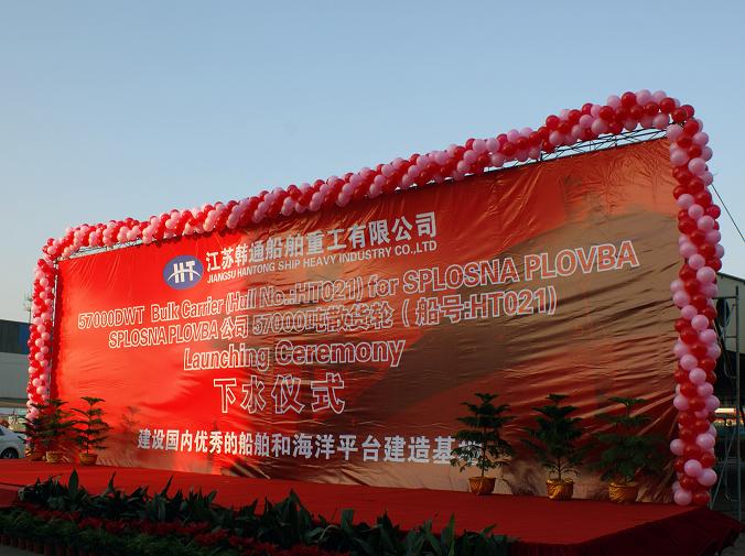 我司為德國(guó)船東建造的57000噸散貨輪(船體號(hào)HT021)于2009年12月18日下午4:30在我司1號(hào)船臺(tái)2號(hào)滑道順利下水,船東SPLOSNA PLOVBA公司董事局主席EGON BANDELJ一行,韓通船舶重工有限公司陳林軍副總,PD項(xiàng)目駐廠(chǎng)經(jīng)理Babic,英勞船級(jí)社駐廠(chǎng)經(jīng)理王谷正和貿(mào)易公司弘業(yè)參加了該儀式。