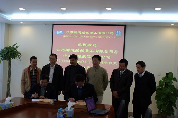 2009年12月18日,在我司行政樓二樓會(huì)議室舉行了韓通船舶重工有限公司與中遠(yuǎn)發(fā)展航運(yùn)有限公司57000噸散貨輪(船體號(hào)HT078)的簽約儀式,該船入CCS船級(jí)社,中遠(yuǎn)發(fā)展航運(yùn)有限公司張志杰總經(jīng)理一行,韓通船舶重工有限公司總經(jīng)理武亦文,副總經(jīng)理陳興參加了該儀式,整個(gè)簽約儀式沉浸在喜欣的氣氛之中,儀式最后大家合影留念。