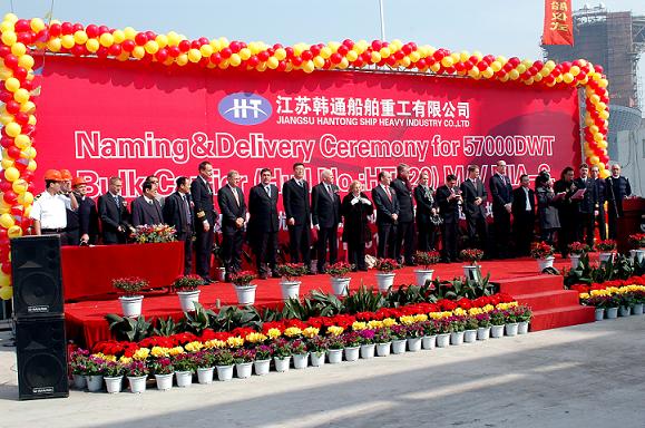2010年1月29日,韓通船舶重工有限公司為Schepers公司建造的第二艘57000噸散貨輪(HT020)達(dá)到了交船狀態(tài),在韓通重工碼頭為該艘舉行隆重的命名及交船儀式。Schepers航運(yùn)公司 Rudolf Schepers 先生和Jan Schepers先生、圣母凱特琳· Schepers女士、中國(guó)航空技術(shù)廈門(mén)有限公司船舶部經(jīng)理林昱先生、英國(guó)勞氏船級(jí)社中國(guó)中部地區(qū)技術(shù)總監(jiān)杰弗· 凱夫先生、江蘇韓通船舶重工有限公司總經(jīng)理武亦文先生共同見(jiàn)證了這一激動(dòng)人心的時(shí)刻,并發(fā)表了精彩的演講。隨后是船舶行業(yè)古老而傳統(tǒng)的砸香檳儀式。它在國(guó)外由來(lái)以久,飽含著祝福和祈禱,預(yù)示著平安和吉祥。在大家倒數(shù)聲中,圣母凱特琳· Schepers女士砍斷纜繩,香檳四濺,音樂(lè)響起,禮花飛舞,鞭炮燃放,全場(chǎng)人員熱烈鼓掌。最后由武總帶領(lǐng)各嘉賓上船參觀。