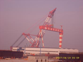 4月18日,為3號(hào)船臺(tái)配套的第一臺(tái)200噸門(mén)吊吊裝完成,并進(jìn)入調(diào)試階段,在5月底投入使用;3號(hào)船臺(tái)是專用海洋工程平臺(tái),第一座SEVAN 300將在上面完成合攏后下水。門(mén)吊由格雷特總包,韓通提供鋼結(jié)構(gòu)的制作,吊裝由上海振華港機(jī)的1800噸的浮吊完成。第二個(gè)門(mén)吊已經(jīng)進(jìn)入制作階段,將在6月份吊裝。