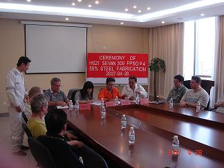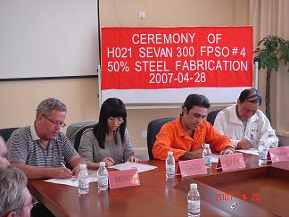 4月28日,在韓通重工5號(hào)會(huì)議室舉行了SEVAN 300(H021)50%分段完成儀式,所有的50%的分段制作已經(jīng)通過(guò)DNV和船東的認(rèn)可,NDT的合格率達(dá)到95%以上。船東和船檢對(duì)公司的質(zhì)量控制和過(guò)程控制比較滿意。該批分段由秦灶公司施工制作,生產(chǎn)設(shè)計(jì)由上海船舶設(shè)計(jì)院完成。