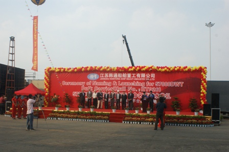 2010年10月8日江蘇韓通船舶重工有限公司迎來了又一個(gè)值得慶祝和紀(jì)念的日子—HT026的命名及下水儀式。該57000DWT散貨輪為我司為船東PD建造,入LR船級(jí)社,該船被命名為“WIDAR”。韓通重工副總經(jīng)理陳興先生,塔姆克航運(yùn)公司迪特里?!に房讼壬?,圣母克里斯汀娜·科普克,Peter Doehle公司W(wǎng)erner Gerdts先生,英國(guó)勞氏船級(jí)社高級(jí)驗(yàn)船師田莊先生等參加了該儀式并發(fā)表講話。
