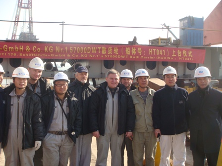 57000噸散貨輪(HT041)上臺(tái) 2011年1月7日我公司為德國CONTI船東建造的57000噸散貨輪(HT041)在新韓通船臺(tái)順利上臺(tái),該船入LR船級(jí)社。