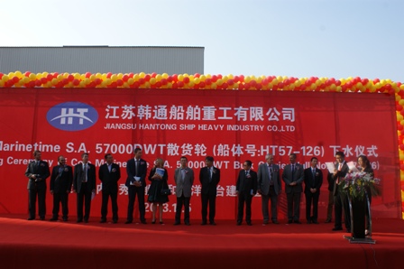 2013年11月5日江蘇韓通船舶重工有限公司迎來了又一個值得慶祝和紀念的日子—HT57-126命名及下水儀式。我司為希臘船東建造的57000DWT散貨輪(HT57-126)在韓通1號船臺順利下水,入NK船級社。周義慶副總經(jīng)理、高振成副總經(jīng)理,船東代表及船級社代表參加該儀式。