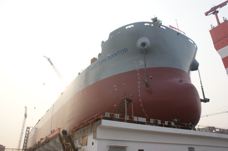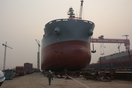 2014年1月17日,我司為日新建造的64000噸散貨輪(HT64-130)在韓通2號(hào)船臺(tái)成功下水,該船入BV船級(jí)社。周義慶副總經(jīng)理、船東代表及船級(jí)社代表參加該儀式。
