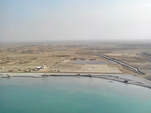 目前沙特SSPP防波堤項(xiàng)目進(jìn)展一切順利。從6月份開工到目前為止,總計(jì)拋石量已達(dá)到128萬m3, 其中南側(cè)拋石量達(dá)383562m3, 北側(cè)644424m3, 排水口252564m3。預(yù)計(jì)還需不到一個(gè)月的時(shí)間,南北側(cè)護(hù)堤全部連接,拋石工作量完成。11月1日起碼頭打樁工程也已經(jīng)開始,截止到11月22日,已經(jīng)完成16根樁接樁,也成功進(jìn)行了14根樁的打樁工作。