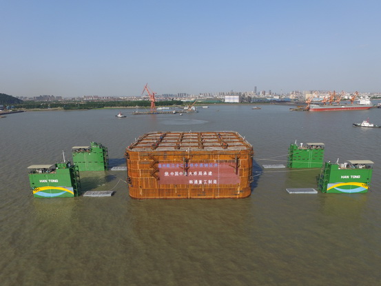 2017年5月16日4:38分,我司承接的中鐵甌江大橋鋼沉井順利下水。該沉井將通過14000噸半潛駁浮運至溫州甌江大橋工程現(xiàn)場下沉。并在錨地下沉起錨后于17日上午4:30拖航去溫州,甌江大橋沉井平面形狀為圓角矩形,鋼沉井總高 59m,鋼沉井井身平面尺寸為 66m×55m,井身材料為 Q345C 鋼材,總重18000噸。