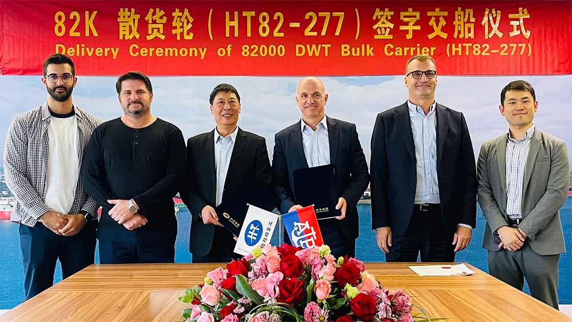 2023年11月8日,韓通為克羅地亞Atlant Kamsarmax Corporation船東建造的82000噸散貨輪首制船 “AP DUBROVNIK”(船體號(hào):HT82-277)成功簽字交付。