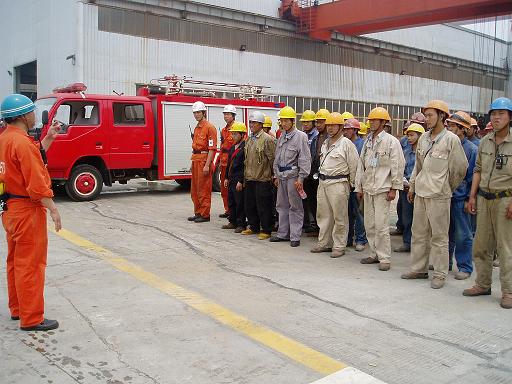 6月15日上午10:30,在江蘇韓通船舶重工有限公司碼頭一艘正在舾裝中的57000噸散貨輪(船體號(hào):HT003)主甲板艏樓濃煙滾滾,刻間火光沖天。單船項(xiàng)目組成員和安全組長立刻嘗試用移動(dòng)滅火器滅火,但是因火源太大,小型滅火失敗。此刻安全組長拉響警報(bào)請(qǐng)求支援,一場消防船舶滅火疏散演習(xí)在濃煙烈火和警報(bào)聲中拉開了帷幕。韓通重工消防隊(duì)接警出動(dòng),出動(dòng)消防車一輛,消防員五名,迅速趕赴火場撲救火災(zāi)。同一時(shí)刻船上項(xiàng)目組通知現(xiàn)場作業(yè)人員關(guān)閉氣源、電源,及時(shí)組織作業(yè)人員撤離現(xiàn)場。而起重組啟動(dòng)應(yīng)急吊籠,消防員在八分鐘之內(nèi)達(dá)到火災(zāi)現(xiàn)場。安全人員將船上作業(yè)人員百余人疏導(dǎo)到緊急集合點(diǎn)。上午10:45,消防員成功撲滅火災(zāi)。