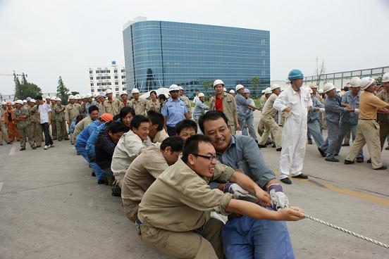 2009年7月17日下午16:00,韓通船舶重工首屆“人和杯”拔河比賽在公司24米主干道上隆重舉行。首先,武亦文總經(jīng)理進(jìn)行了開幕致詞,充分肯定了這次活動的意義,并對參賽人員進(jìn)行了鼓勵(lì);陳林軍副總經(jīng)理宣講了比賽規(guī)則以及比賽陣容。隨后,比賽正式開始。