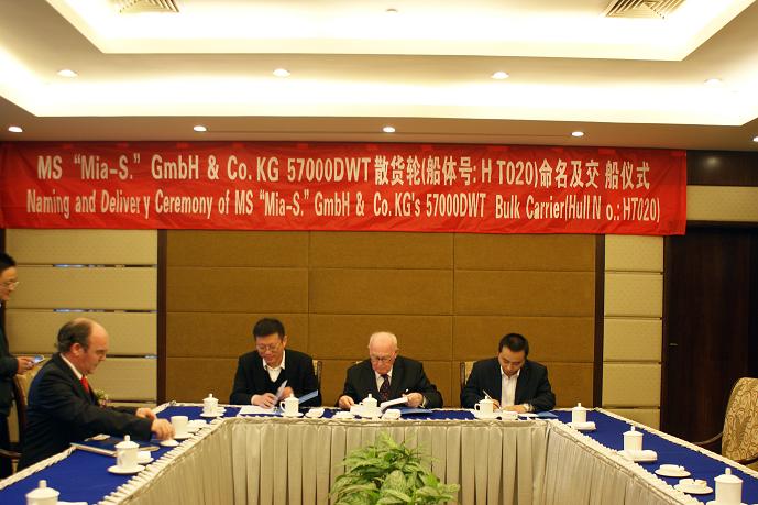 2010年1月29日,韓通船舶重工有限公司為Schepers公司建造的第二艘57000噸散貨輪(HT020)達(dá)到了交船狀態(tài),在韓通重工碼頭為該艘舉行隆重的命名及交船儀式。Schepers航運(yùn)公司 Rudolf Schepers 先生和Jan Schepers先生、圣母凱特琳· Schepers女士、中國(guó)航空技術(shù)廈門(mén)有限公司船舶部經(jīng)理林昱先生、英國(guó)勞氏船級(jí)社中國(guó)中部地區(qū)技術(shù)總監(jiān)杰弗· 凱夫先生、江蘇韓通船舶重工有限公司總經(jīng)理武亦文先生共同見(jiàn)證了這一激動(dòng)人心的時(shí)刻,并發(fā)表了精彩的演講。隨后是船舶行業(yè)古老而傳統(tǒng)的砸香檳儀式。它在國(guó)外由來(lái)以久,飽含著祝福和祈禱,預(yù)示著平安和吉祥。在大家倒數(shù)聲中,圣母凱特琳· Schepers女士砍斷纜繩,香檳四濺,音樂(lè)響起,禮花飛舞,鞭炮燃放,全場(chǎng)人員熱烈鼓掌。最后由武總帶領(lǐng)各嘉賓上船參觀。