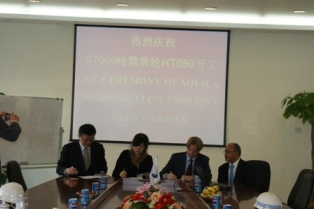 2010年12月8日上午10:30,在我司新船體車間舉行57000噸散貨輪(船體號:HT090)開工儀式,本船為Aquila Shipping LLC 建造的系列船的首制船,該船入LR船級社,計劃于2011年10月31日交船。我司總經(jīng)理武亦文先生,副總經(jīng)理陳興先生及船東船檢代表參加了開工儀式。開工點火后,在韓通會議室簽署了開工文件。
