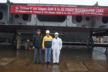 我司為德國船東建造的57000噸散貨輪(船體號:HT025)于2010年12月13日上午10:30在我司2號船臺舉行了上臺儀式,該船入LR船級社,計劃2011年5月31日交船。李繼念副總及船東船檢代表參加了該儀式。